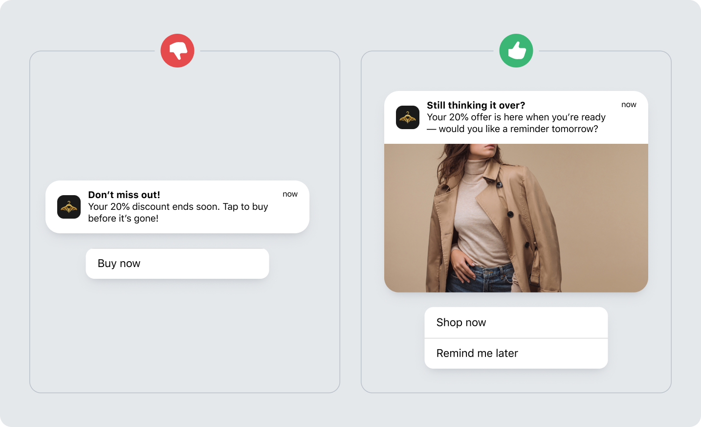 We’re not advocating for you to remove the option to say “no.” But it’s worth pointing out that every option should feel intentional. Users can buy now, be reminded later, or ignore the message entirely, and all three choices feel valid. Both versions drive action, but only one builds trust by respecting the user’s sense of control.