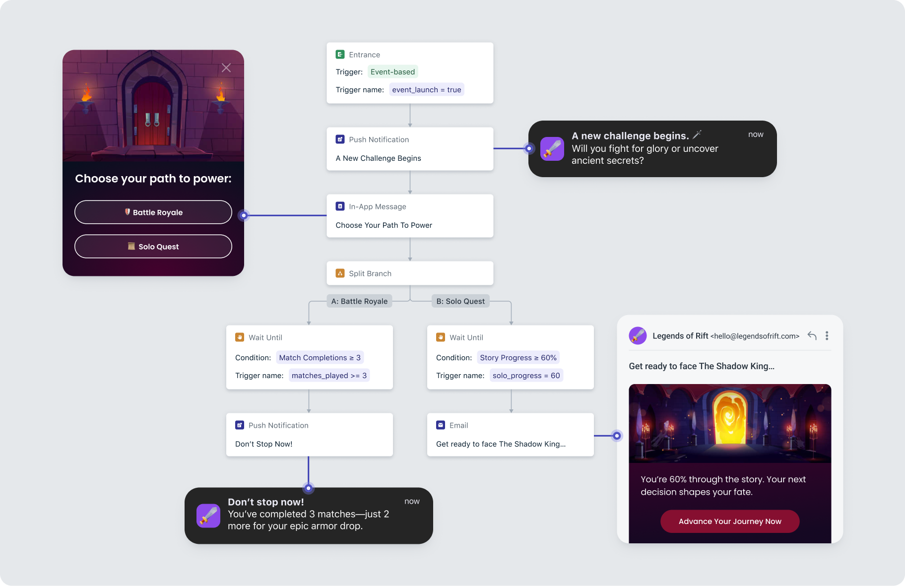 With OneSignal, you can design these decisions dynamically using Events, Journeys, and Intelligent Delivery. Every message adapts to the user’s behavior, timing, and preferences— creating a journey that feels hand-guided.
